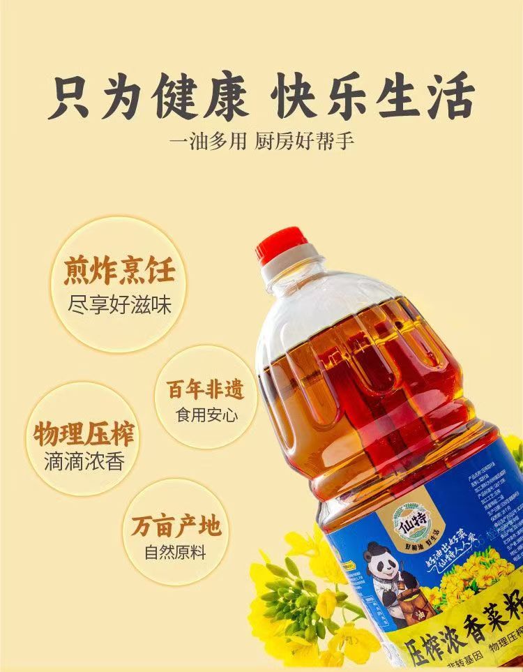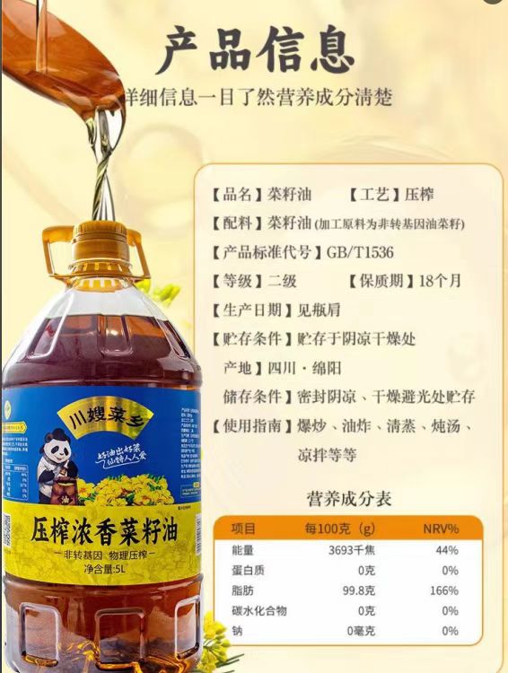 壓榨濃香菜籽油,源自四川綿陽精選優質非轉基因油菜籽,秉承傳統小榨工藝,充分保留了菜籽的營養成分與濃郁香氣。其獨特的濃香風味,適合煎、炒、炸等多種烹飪方式。 保質期:18個月 執行標準:GB/T 1536 儲存方式:存放于陰涼、干燥處 規格:900ml、1L、1.8L、2.5L、5L、12.5L、27L等多種規格