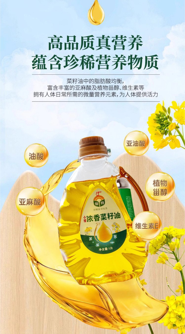 仙特壓榨菜籽油,源自四川綿陽精選優質非轉基因油菜籽,秉承傳統小榨工藝,熱榨濃香,冷榨純香,充分保留了菜籽的營養成分與濃郁香氣。不添加任何化學溶劑,確保油品健康天然。成品油色澤清亮,適合煎、炒、炸、蒸等多種烹飪方式。